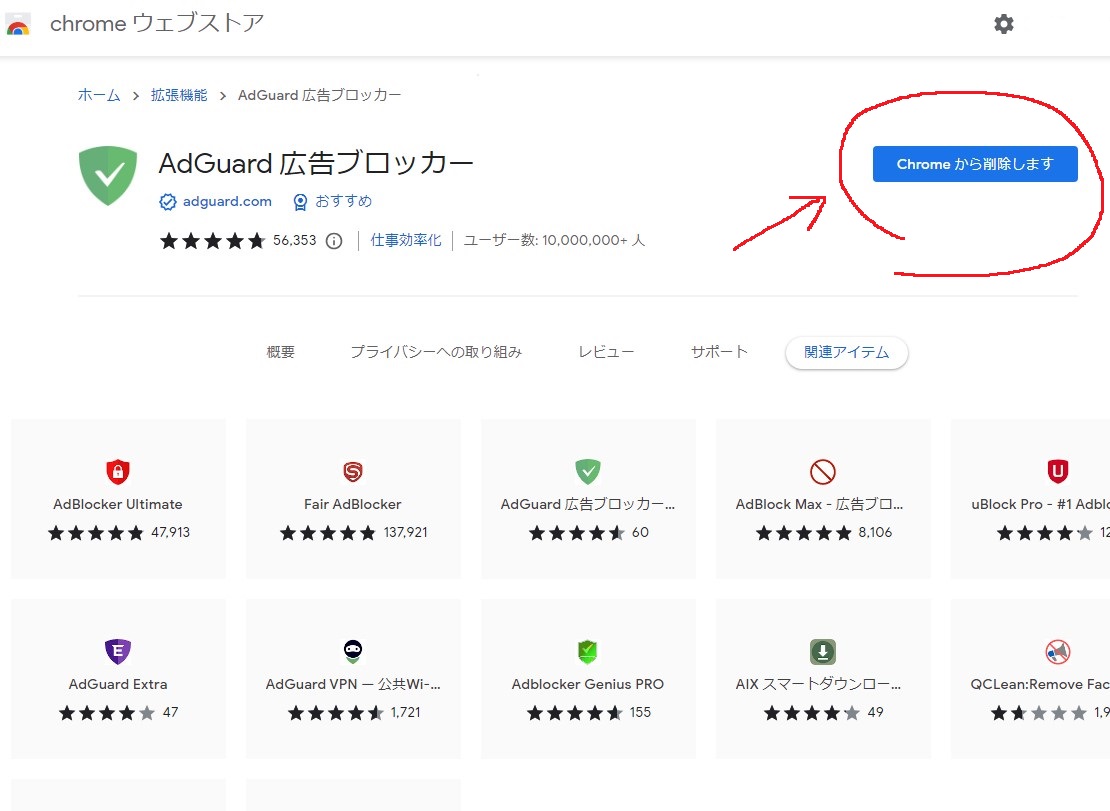 AdBlock 最高峰の広告ブロッカーのサイトを開いて右上の「chromeから削除します」をクリックするだけ。これだけです。