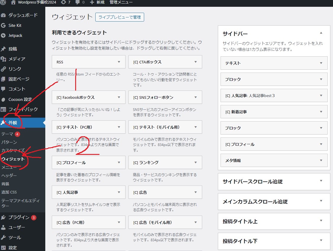 まずは、WordPressのダッシュボードの左列にある①「外観」をクリックして、②「ウィジェット」をクリックしてください。