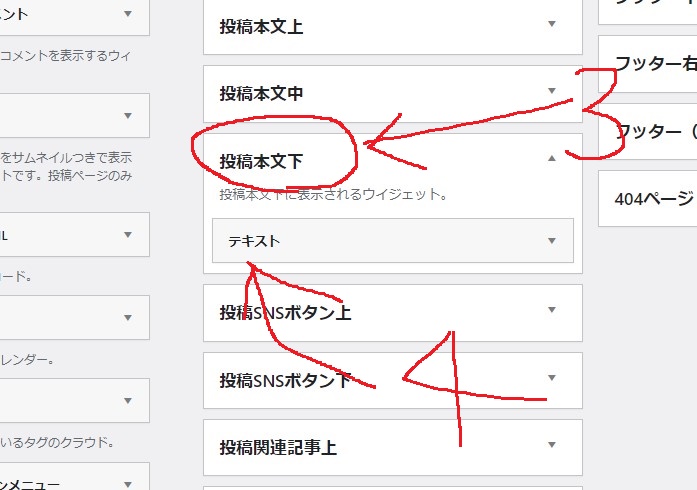 次に、右側に現れるウィジェットの中から③「投稿本文下」をクリックします。